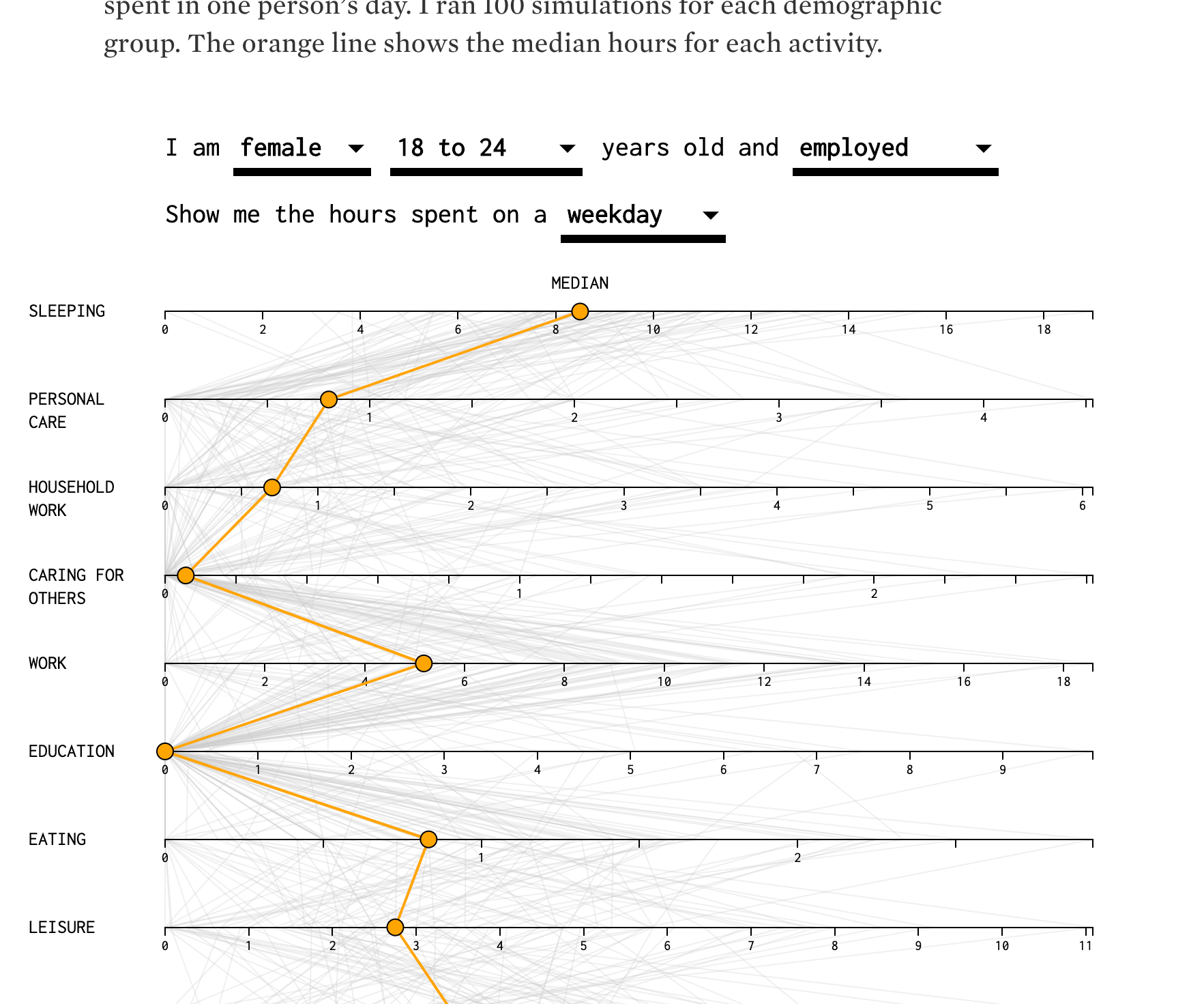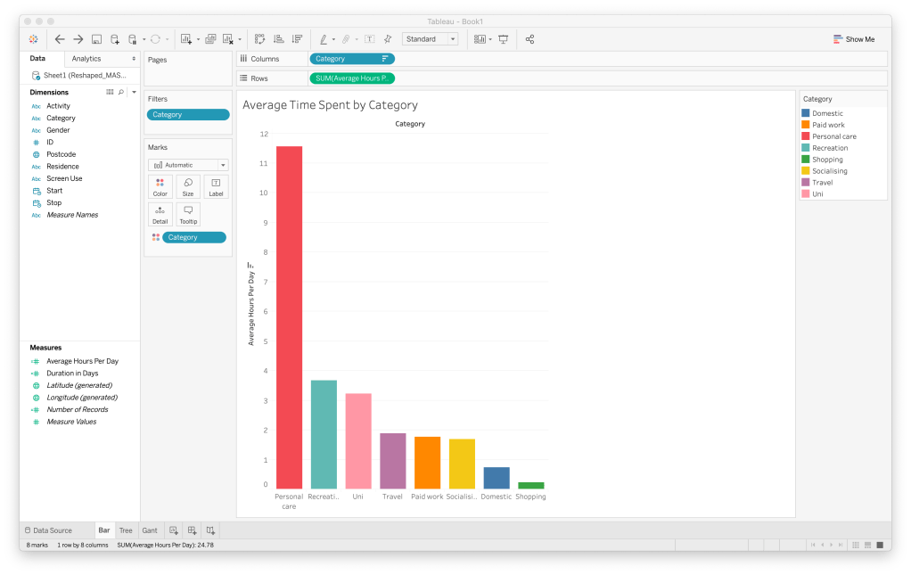This data piece tells the narrative of how different groups of people spend their time in a 24-hour period.