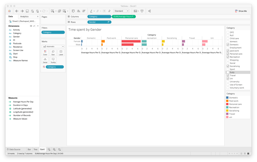 You are able to interrogate the data by gender, age, employment status and organising the data into a weekday or weekend. By filtering the variables the chart will determine the median hours for each activity shown through the orange line. At this point you can’t interrogate the data any further. We can’t interrogate the activities into sub categories. For example, under the activity travel/commute, we are unable to determine the type of transportation used.
