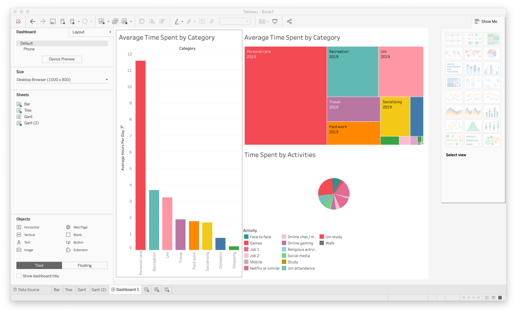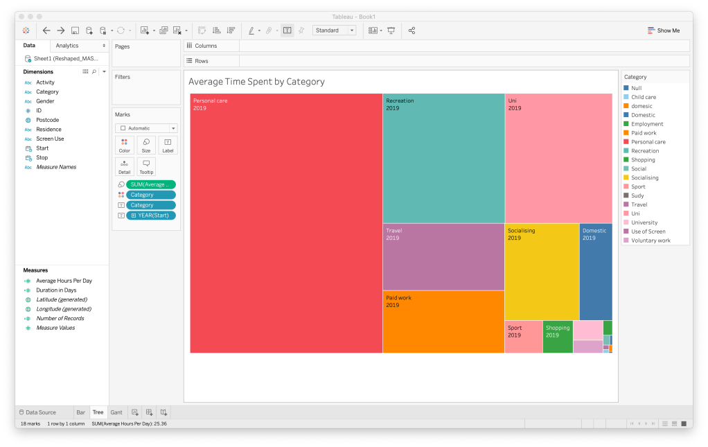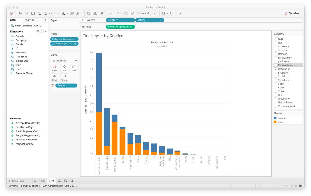 From the gannt chart shown above, females spend more time on personal care than men but the same amount on recreation. Even though there may be more females in the data, the results show how they use they use their time. It’s interesting to see that the recreation results for both genders are similar. By looking further into the recreation category, you can see that men are spending more time on video games while women spend double the amount on social media.